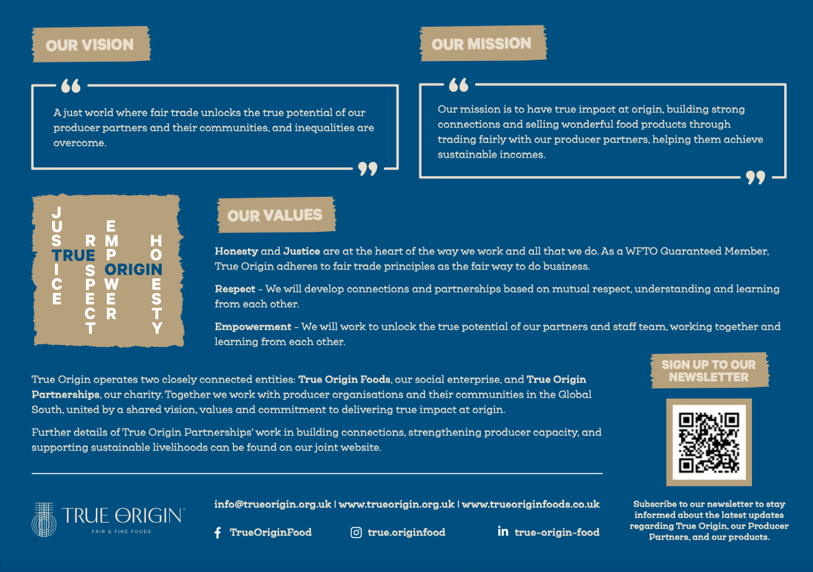 This new leaflet focuses on the work of True Origin Foods — the trading side of our organisation — and how our commercial activities directly create positive impact at origin. Alongside this, True Origin Partnerships strengthens relationships and builds producer capacity, supporting sustainable livelihoods through project work.