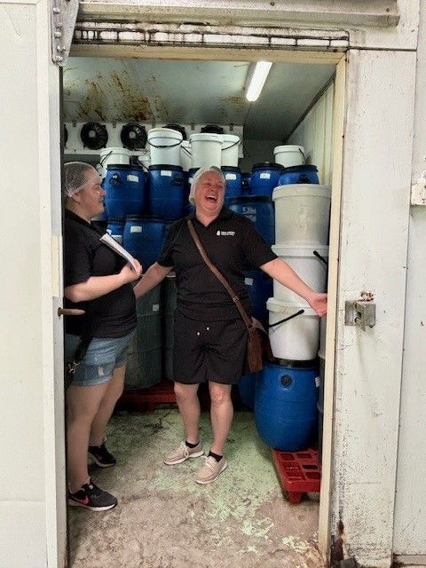 Next up was a tour of the factory by Carlos and Damien de Sousa. They were keen to show us where they started, where they are now, and where they hope to be in terms of factory capacity. They have plans to automate certain parts of the production line in order to be more efficient and save in production time. Carlos talked us through the current process and explained what each piece of equipment does. Jade and I showed great interest in the freezer room and just had to step inside to cool our burning hot Scottish skin down.