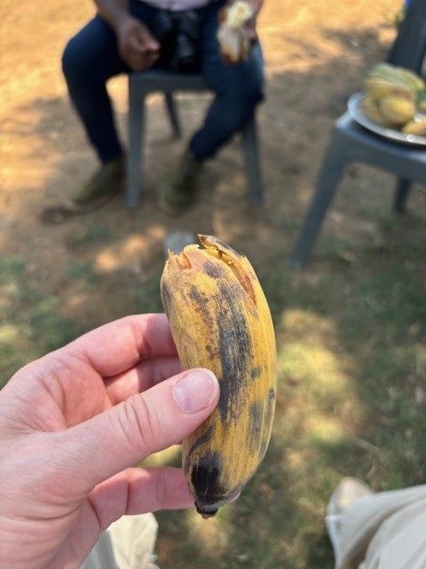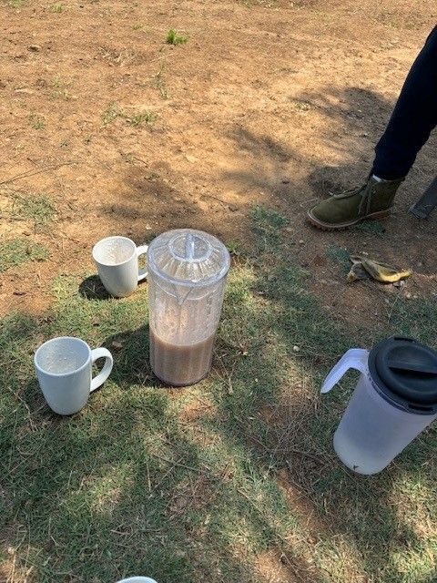 Nomfundo came with us to the next farm we visited belonging to Paulini Mkhatjwa. We learnt that the animals are kept in a kraal (pronounced crawl) at night, this is an enclosure made of upright branches which is also used as a meeting place or social space for the men of the homestead. Paulini is growing lots of crops including maize, tomatoes, green peppers, lettuce, cabbage, onions, coffee, bananas to name but a few. Her land is on a slope so she has had to make several terraces so that the crops do not wash away when it rains, the hilly terrain mean that many farmers have to do this. She insisted that we try a drink she made for us all which I can only describe as runny porridge, it doesn’t translate in English. It is made with leftover porridge and fermented fruit and is drank for breakfast and as a snack throughout the day. She served us this with the tiniest sweetest bananas I’ve ever tasted, they were super yummy.